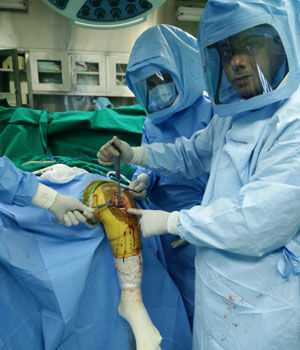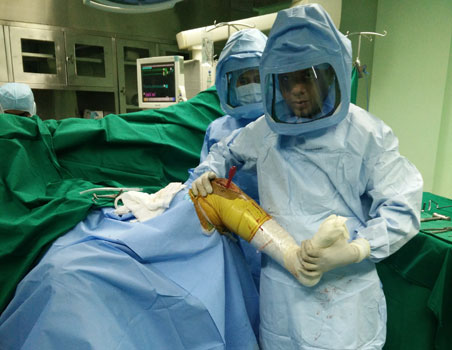 Before beginning to scrub the surgeon wears the body exhaust mechanism attached to a battery. This system is then covered with water impermeable hoods, so that no part of the surgeons body is exposed. This is an international protocol followed by all joint replacement surgeons.