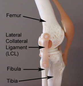 The Lateral Collateral Ligament (LCL) connects the Femur to the Fibula and stabilizes the outer side of the Knee.