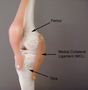Injuries to the MCL are usually caused by contact on the outside of the Knee and are accompanied by sharp pain on the inside of the Knee. Being fairly large and vascular, the Medial Collateral Ligament has an excellent ability to heal.